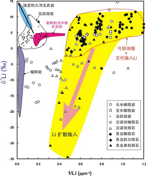 图注:地幔橄榄岩Li(锂)含量和Li同位素组成的变化特征