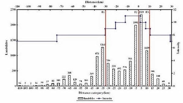 对该规律的认识近期发表在国际工程地质权威刊物Engineering Geology(Qi et al. Spatial distribution analysis of landslides triggered by 2008.5.12 Wenchuan Earthquake, China. Engineering Geology, 2010, 116: 95-108)。