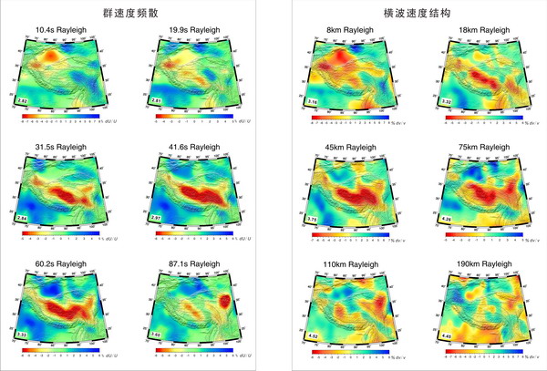 地质地球所青藏高原研究室陈赟助理研究员及其合作者在系统收集青藏高原周边地区13个地震台站记录的1980年以来地震数据的基础上,通过提取瑞利波(Rayleigh Wave)和勒夫波(Love Wave)10~105s群速度频散(图1),进而反演研究区地壳上地幔的三维横波速度结构(图2)。通过系统分析和定量计算表明,该项研究所利用的地震射线平均路径长度约2000km,对青藏高原本体的覆盖比例达75%左右,横向分辨可达200 km左右;震源误差引起的频散误差与频散测量的系统误差接近,均值 ≤0.02 km/s;通过进一步的分析和论证,表明经典射线理论在本项研究中仍然是适用的,而基于目前资料的积累程度,更小尺度的网格划分是不现实的。