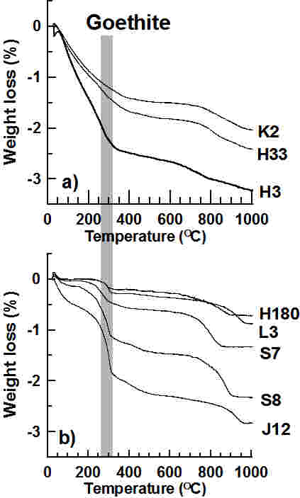 图1显示,在300℃时,立方体样品释放了>1%的晶格内的水。如果扣除针铁矿的影响(250-300℃之间的异常影响),非立方体样品释放的水成分要小于1%。这说明立方体样品中含有更多的晶格缺陷。受到晶格缺陷的影响,第一类样品的Morin转换被压抑,等温剩磁较高,矫顽力也较高。相反,非立方体样品具有很好的Morin转换,等温剩磁和矫顽力都较低(图2)。