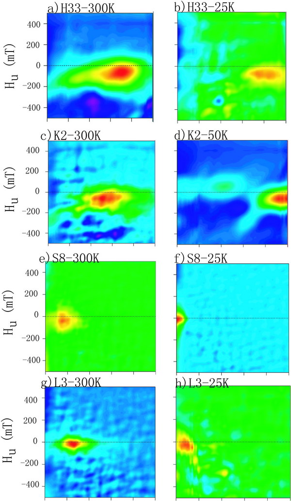 等值线的中心点向右表示矫顽力高,显然这两类样品具有完全不同的矫顽力分布