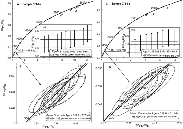 地质地球所苏文研究员和高俊研究员等人通过对西天山高压-超高压变质带中榴辉岩锆石Cameca U-Pb年代学研究,获得榴辉岩的峰期变质年龄为320Ma(晚古生代石炭纪期间),从而精确限定了塔里木和伊犁地块之间的碰撞事件发生的时间。他们对产于绿片岩和蓝片岩围岩中的榴辉岩透镜体(大小约0.69 x 0.93m2,GPS坐标42°30′29.6″N,81°14′51.4″E)的两个代表样品进行了U-Pb年代学研究。发现锆石边部含有高压变质矿物的包体,同时获得锆石边部U-Pb年龄319.5 ± 2.9 Ma和318.7 ± 3.3 Ma。锆石边部包体大小1 × 6 μm – 3 × 18 μm,经详细激光拉曼光谱研究,确定包体矿物为绿辉石、多硅白云母和金红石(图1),说明该锆石的边形成于峰期高压变质条件之下。071-6a样品的协和年龄319.9 ± 2.7 Ma(MSWD = 1.13)、206Pb/238U 平均年龄 319.5 ± 2.9 Ma(MSWD=0.6)(图2-A, B),Th/U比值为0.002至0.004;071-8a样品的协和年龄319.8 ± 3.1 Ma(MSWD = 3.3),206Pb/238U平均年龄318.7 ± 3.3 Ma(MSWD=0.64)(图2-C, D),Th/U比值为0.002至0.016。同时还获得锆石核部年龄2450–1956 Ma, 幔部年龄486–428 Ma。