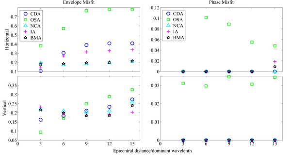 他们的研究结果表明:(1)composed方法在Vs/Vp小于0.57时不稳定;(2)one-sided方法因为在边界上精度是一阶的,因此在模拟波长较小的面波时存在着较大误差,其他方法都具有二阶精度;(3)new composed,implicit,boundary-modified approximations三种方法即使在Vs/Vp小于0.2时也稳定;(4)implicit 和 boundary-modified approximations方法能够处理横向变速介质的自由表面;(5)one-sided方法在振幅和相位上与解析解都匹配的较差,其他方法与解析解在相位上较振幅上匹配的好。