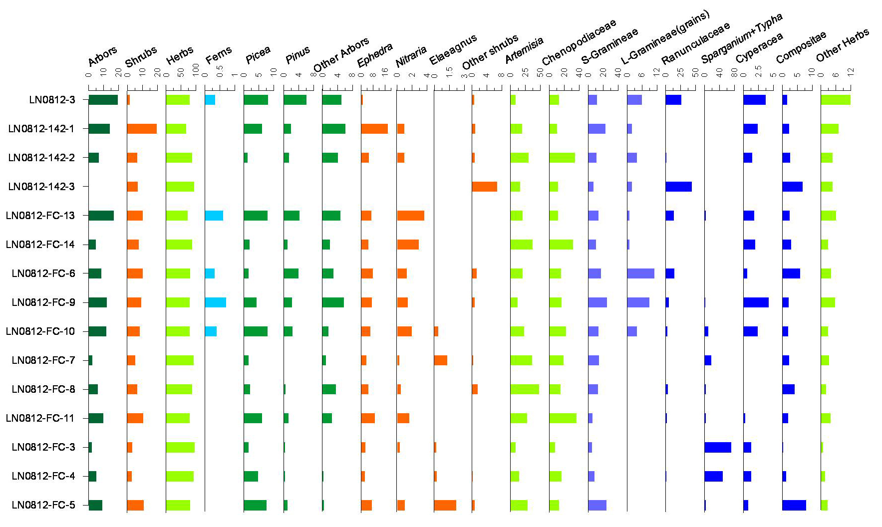 图4:楼兰地区耕地及非耕地表土花粉组合对比图 (单位: %. S-Gramineae: 花粉直径<50µm. L-Gramineae:花粉直径>50µm 且单位是花粉颗粒数) (采自耕地的样品: LN0812-3, LN0812-142-1~3, LN0812-FC-13, 14, LN0812-6~10, LN0812-FC-11. 采自非耕地的样品:LN0812-FC-3(N40º38’44.9“, E90º7’7.2”, LE 方城遗址城外), LN0812-FC-4 (N40º35’42.3", E89º57’25.3"), LN0812-FC-5(N40º34’54.7", E89º57’36.3"))