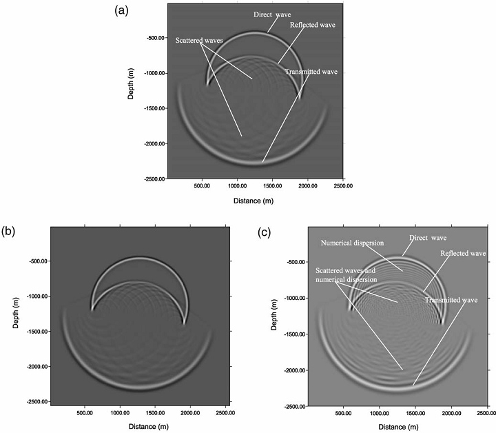 图1:不同波场模拟方法性能的比较:(a)MDSCD 的模拟结果;(b)伪谱法的模拟结果;(c)高阶有限差分法的模拟结果。
