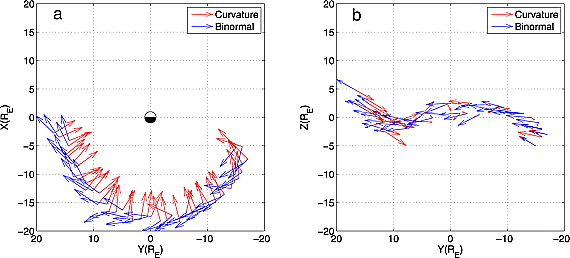 图1:磁尾电流片中心处磁场曲率方向和副法线方向分别在XY平面和YZ平面上的投影。