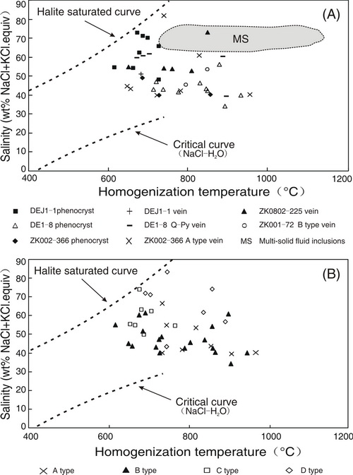 图2:多不杂斑岩铜金矿床高温流体包裹体的盐度-均一温度图解