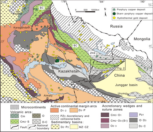 图1:新疆北部和邻区东哈萨克斯坦古生代地质构造简图(显示早古生代波谢库尔-成吉斯(BC)火山弧和晚古生代扎尔玛-萨吾尔(Zha)火山弧位置)