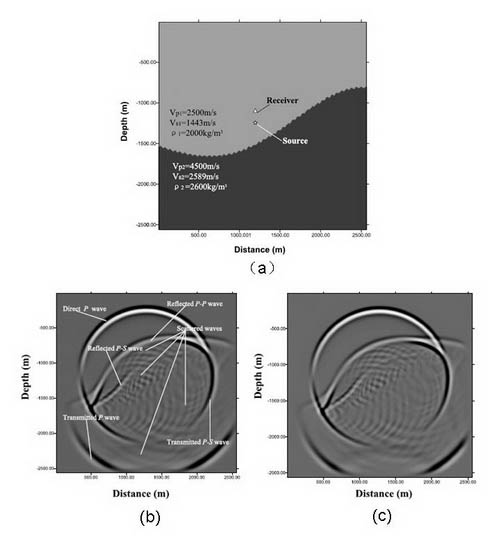 图1:不同波场模拟方法比较(a)非均匀介质模型;(b)SDSCD方法的模拟;(c)伪谱法的模拟结果。