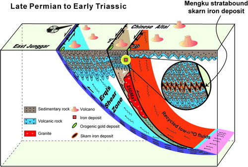 地质与地球物理研究所固体矿产资源研究室造山带与成矿作用课题组的万博副研究员及其合作者对新疆阿尔泰地区的蒙库铁矿进行了详细的构造观察、成矿年代测定及成矿物源分析。构造观察发现成矿岩石切穿已经变形地层的褶皱轴,表明成矿远晚于地层的变形时代;成矿热液锆石的原位氧同位素分析表明成矿流体以变质流体为主;精确的成矿时代测定表明成矿年代与区域走滑断裂时代相似但远晚于区域的岩浆时代,综合以上研究他们指出铁矿的富集与该区晚古生代-早中生代活动的巨型走滑断裂—额尔齐斯断裂存在成因联系(图1),并提出了“造山型”铁矿的成矿模型。