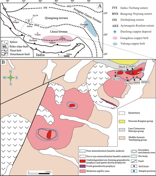 图1:青藏高原碰撞造山带构造分区图(a)和西藏班公湖带多龙富金斑岩铜矿床地质简图(b)