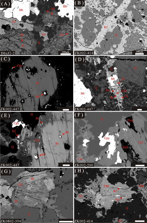 (A)钠长石沿着斜长石的裂隙和边部交代,石英-磁铁矿-钾长石组合;(B)钾长石细脉;(C)黑云母斑晶中的磁铁矿;(D)石英-磁铁矿-黑云母脉,黑云母局部发生绿泥石化;(E)黑云母斑晶包裹磁铁矿和金红石,局部发生绿泥石化;(F)石英-绿泥石-方解石-黄铜矿-石膏脉;(G)次生黑云母绿泥石化;(H)次生绿泥石与石英、钾长石、磷灰石和金红石伴生。