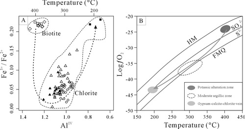图3:黑云母和绿泥石的Fe3+/Fe2+-AlIV和氧逸度 (fO2) –温度(T)图解;