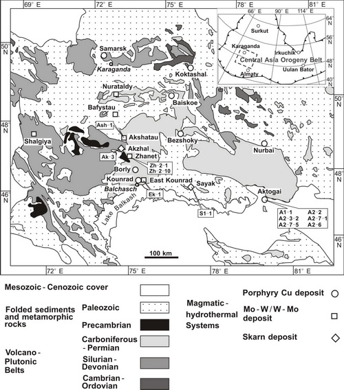 图1:中哈萨克斯坦区域地质图与矿床分布图