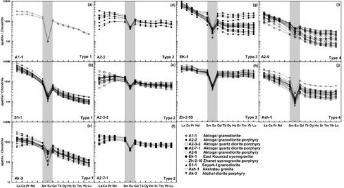 图2:中哈萨克斯坦花岗质(斑)岩相关矿床中磷灰石的稀土配分模式