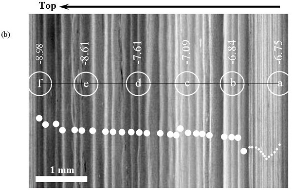 图1 (a)北京苦栗树洞BW-1石笋的氧同位素记录;(b)BW-1石笋69-74 mm区间的反射光映像图。该图表明YD事件快速关闭由38年层组成(白色实心圆)。