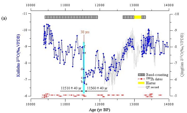 新仙女木事件(Younger Dryas event,简称YD)是发生在末次冰期向全新世转换期间持续约1300年的一次非轨道气候事件,以最初在丹麦Allerød冰缘沉积物中发现的北极苔原植物仙女木(Dryas Octopetala)命名。该事件的特点是快速和剧烈降温,其温度在几十年甚至几年内迅速降低了约15ºC达到冰期时的水平,是目前全球范围内最受关注的一次快速气候变冷事件。然而,对其触发时间、触发地点、触发机制以及是否是一个全球性事件一直存在争议,“北大西洋温盐环流(THC)”、“太阳辐射触发”、“大气-海洋-陆地碳循环”、“慧星撞击”等假说都在寻找支持证据以解答其科学命题。因此,对不同地区YD事件的起止时间﹑变幅及其触发机制进行研究,在认识气候快速变化规律和预测未来气候变化趋势上都有十分重要的意义。