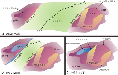 对~21和~19亿年岩浆岩带内的岩浆岩岩石化学特征和活动序列的对比研究表明,这两个岩浆岩带形成于完全不同的构造背景。它们分别分布于华北古陆东部和西部,两者分布范围以孤山-马市口一线为界,两个带互不重叠。结合前人对区域变质历史和构造变形历史的解译,这两个岩浆岩带可能形成于两个当时并不相连的陆块,两个陆块在19-18亿年期间沿着孤山缝合带拼贴形成华北古陆(图2)。
