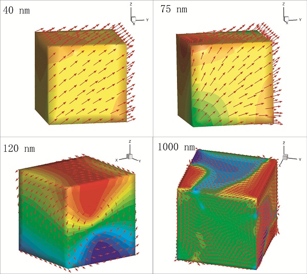 40nm:稳定单畴;75nm:花状;120nm:漩涡状;1000nm:多畴