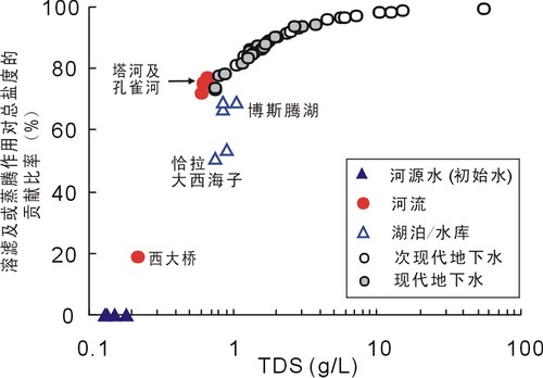 他们以新疆塔里木河流域为例,通过研究指出由于河流流速较快、蒸发较为微弱,但受农业排盐和引水等影响,博斯腾湖、孔雀河和塔里木河的溶滤作用对总盐度的贡献率在67-77%;受河水补给的中下游河岸带地下水的溶滤贡献率在73%到99.6%之间。河岸带地下水的盐度与河水补给速率、地下水运动条件、埋深与含水层介质含盐量等因素有关。