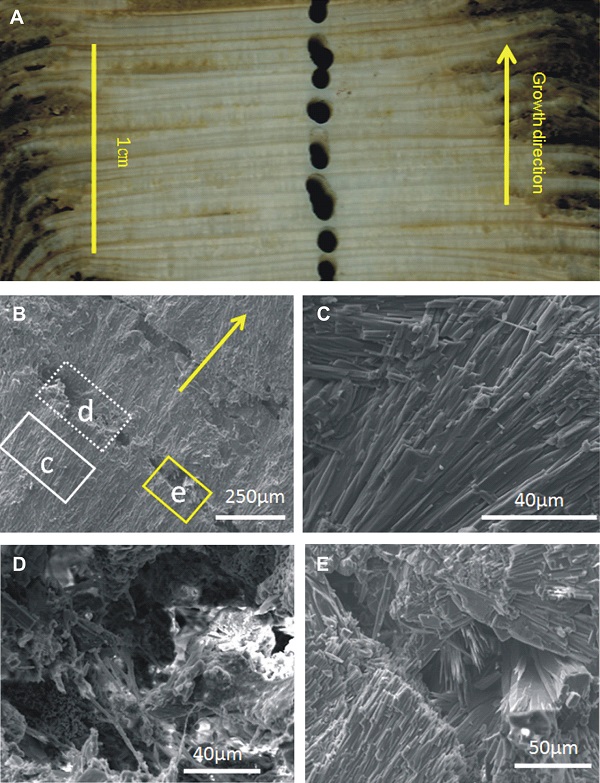 A、印度Chulerasim 洞石笋剖面的扫描图片;B、石笋微层的扫描电镜图片,其中箭头指示生长轴方向;C、图B中虚线框“c”部位的扫描电镜图像;D、图B中虚线框“d”部位的扫描电镜图像;E、图B中虚线框“e”部位的扫描电镜图像。