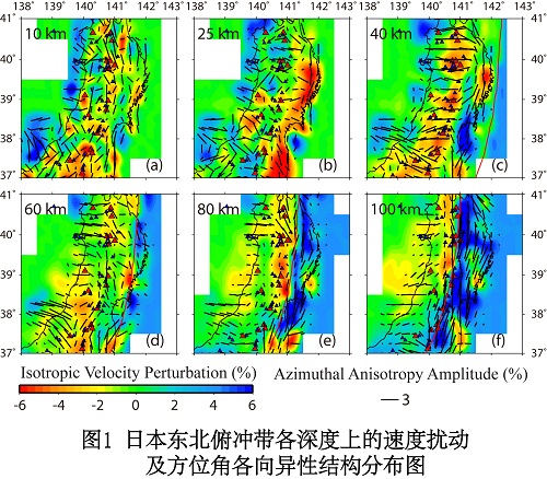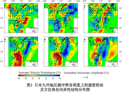 地质地球所地球深部结构与过程研究室地震学学科组王建副研究员与日本东北大学赵大鹏教授合作,利用区域地震的P波震相数据对日本俯冲带地区进行了方位及径向各向异性层析成像研究。研究结果表明俯冲带内部的各向异性结构非常复杂,日本东北俯冲带(图1和图2)与九州地区俯冲带(图3和图4)的各向异性结构存在着异同,例如:弧前地幔楔中存在与海沟平行的方位角快速方向;弧后地幔楔中主要表现为与海沟垂直的方位角快速方向;俯冲的太平洋及菲律宾板块表现为与海沟平行的方位角快速方向;负的径向各向异性主要存在于火山链下方地幔楔中的低速体中,而正的径向各向异性(水平P波速度>垂直P波速度)结构主要存在于俯冲板块内;日本东北地区火山链下方地幔楔中存在着与海沟平行的方位角快速方向,而九州地区火山链下方似乎不存在此各向异性特征等。这些研究结果为俯冲带的岩石学及动力学研究工作提供了新的地球物理证据。