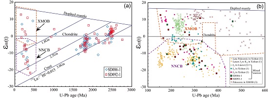 地质地球所岩石圈演化研究室博士生徐建强在导师李忠研究员的指导下,重点采用砂岩碎屑和重矿物高分辨率物源分析方法研究了鲁西隆起北部侏罗系碎屑物源,并综合探讨了华北东部侏罗纪构造古地理演化。研究结果显示,侏罗系砂岩样品的前寒武纪碎屑锆石U-Pb年龄及其Hf同位素组成与广泛出露于北部的华北克拉通基底一致(图1)。根据缺乏新元古代中期(700~850Ma)岩浆年龄和三叠纪变质年龄的事实,他们排除了扬子板块及现今临近于鲁西隆起东南部的苏鲁造山带物质来源。显生宙年龄(256~393Ma)记录的晚古生代岩浆活动均未发现于鲁西隆起及其邻近地区,而依据其εHf(t)值特征可分为-21.9~-3.0和-1.0~+12.7两部分(图1),可分别与华北北缘和兴-蒙造山带对比。综合砂岩碎屑模式以及沉积体系分析指示,从早-中侏罗世到晚侏罗世来自华北北缘和兴-蒙造山带的碎屑物源具有增长趋势。