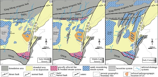 图2 华北东部早-中侏罗世(a)、中-晚侏罗世(b)和早白垩世(c)构造古地理格局