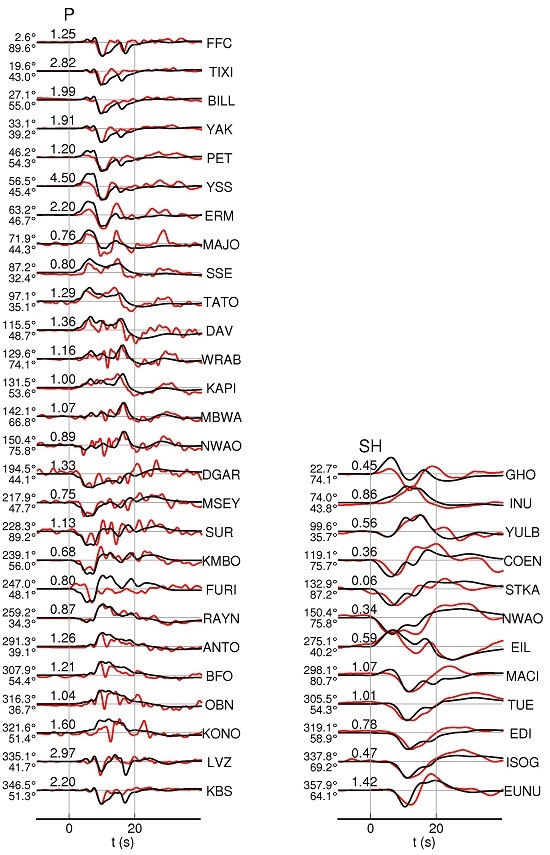 Comparison of observed (black) and synthetic waveforms (red) for P vertical components, and SH components are shown in the panel, the azimuth, epicentral distance, amplitude ratio and station name are also indicated.