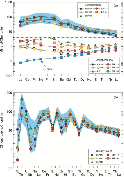 图3 赛利普地幔包体的单斜辉石和斜方辉石的微量元素组成
