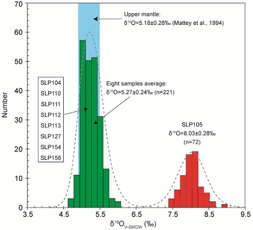 他们的研究表明,同一个样品中不同颗粒橄榄石颗粒具有均一的氧同位素组成。其中8个样品的橄榄石的氧同位素组成(δ18O=5.27±0.27‰)与上地幔值一致,而另外一个样品(SLP105)中橄榄石的氧同位素组成(δ18O=8.03±0.28‰)则明显高于上地幔值(图2)。结合这些包体的其它矿物地球化学资料,他们排除了样品SLP105中橄榄石的高δ18O值是由于寄主岩浆的扩散作用和熔岩反应这两种可能性造成的,认为其高δ18O值反映了其来源的岩石圈地幔的特征。