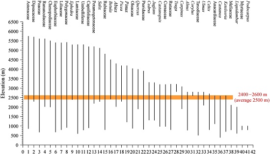 图2 依据晚渐新世-早中新世化石孢粉的现存最近高原亲缘类群对高度的耐受范围,获得对高度的共存区间为2500 ± 100 m,该高度在经过地质时期温度和垂直气温梯度校正后,获得伦坡拉地区晚渐新世-早中新世的最大高度为3190 ± 100 m