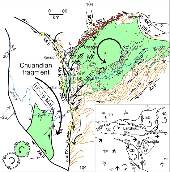 地质地球所特提斯研究中心王二七研究员及合作者注意到,与龙门山断裂呈鲜明对比的是,将龙门山与扬子地块左行错断的鲜水河-小江断裂带具有高度的构造和地震活动性,其左行走滑运动反映出青藏高原向南东方向的生长。他们在系统地研究龙门山断裂带以及邻近的四川盆地的新生代变形基础上,发现四川盆地的变形十分奇特,即变形程度从边缘向中心逐渐减弱,而且变形多形成于构造叠加作用。叠加形式反映出盆地周边发生过连续的右行剪切,这表明四川盆地相对于其周边地区发生过逆时针旋转,四川盆地现今的地表变形和地貌均形成于此构造运动。他们根据四川盆地与鲜水河-小江断裂的交切关系,提出四川盆地的逆时针旋转运动可能是青藏高原沿鲜水河-小江断裂向南东生长产生的牵引作用造成的(图1)。根据鲜水河断裂和龙门山断裂作用的时间,他们提出四川盆地的逆时针旋转发生在中新世中晚期(13-15百万年),并由此得出结论:龙门山的右行压扭性运动以及由此引发的汶川大地震是四川盆地的逆时针旋转造成的,而与青藏高原向东的生长无关。