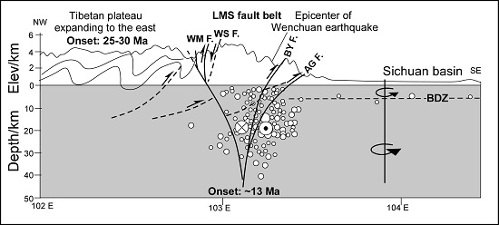汶川地震震源深度以及震中在龙门山的位置表明地震断裂是高角度的,王二七等人的研究认为,发震构造并不是向西倾的铲型断裂,而是一个深部近直立的花状构造,形成于四川盆地的逆时针旋转(图2)。而前述铲型断裂是个老断裂,可能形成于王二七等人另一项研究厘定出的第三纪中期(30-25百万年)高原上地壳的扩展(Wang et al. 2012. Nature Geosciences)。此外,他们根据四川盆地发生的差异性变形特征提出:四川盆地的旋转运动不仅在水平方向,而且在垂直方向也是不均一的,在旋转过程中沿一系列软弱带,特别是中下三叠统含膏-盐层发生了滑脱(图2)。