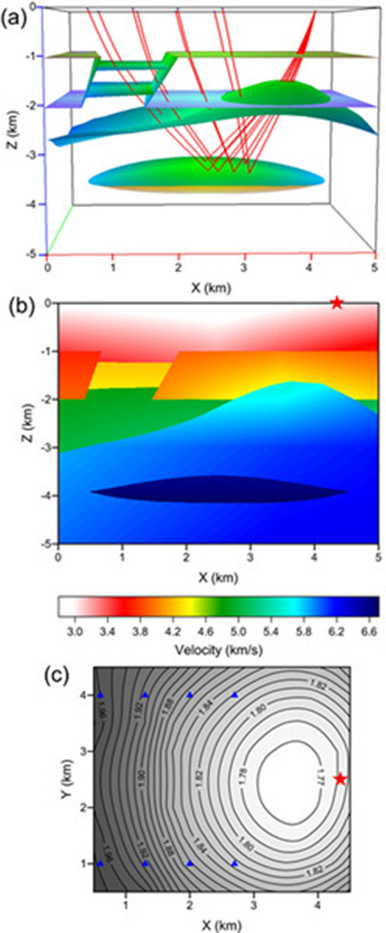 图2:(a)三维复杂地质速度模型上的地震波传播路径;(b)速度模型切片;(c)地震波走时等值线