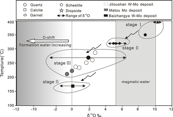 图1 长江中下游池州地区矽卡岩-斑岩型钨钼矿流体演化过程中氧同位素变化