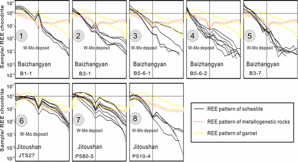 在以上研究基础上,他们重点对该成矿系统中大量发育的白钨矿进行了矿物学工作研究,并获得如下认识:(1)明确提出白钨矿形成过程中REE以3Ca2+ =2REE3+ + □Ca替代机制进入白钨矿,继承了成矿流体稀土元素特征;(2)矽卡岩化过程中,石榴子石、透辉石等矿物的连续沉淀导致白钨矿的轻稀土与中-重稀土解耦现象,这是强烈亏损重稀土的主要原因(图2);(3)白钨矿形成于相对弱氧化-弱还原过渡环境,Mo元素在弱氧化环境下在白钨矿中强烈富集并随着流体还原性增强,钼与钨逐渐分离(图3);(4)白钨矿REE稀土配分型式能有效地对脉状金矿、脉状金-钨矿、矽卡岩型钨钼矿及斑岩型钨钼矿等含钨矿床进行区分(图4)。