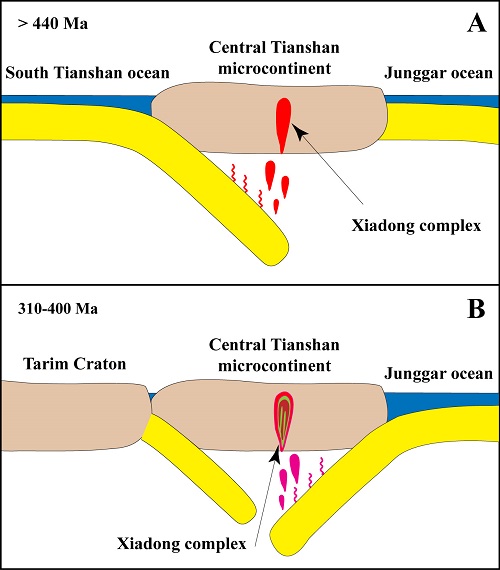 地质与地球物理研究所固体矿产资源研究室苏本勋副研究员在前期研究的基础上,对峡东岩体展开了更为深入的岩石学、地球化学和年代学研究工作。岩石学和地球化学结果更进一步证实该岩体为典型的阿拉斯加型岩体,具有铬铁矿和铂族元素的找矿潜力。研究的4个样品的锆石年代学工作其形成的时代跨度较大,为313-479Ma(图1),应为长期弧岩浆作用的产物,其地球化学成分与时代相关。时代较老的岩石显示南天山洋俯冲的特征,时代较新的岩石具有准噶尔洋俯冲的痕迹。这项工作进一步表明中天山微陆块古生代时期处于大陆岛弧环境,经历了南部的南天山洋和北部的准噶尔洋的相继俯冲(图2)。