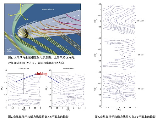 与地球不同的是金星不含全球磁场,太阳风携带行星际磁场直接与金星上层大气/电离层相互作用。由于行星际磁场与金星电离层的切割运动,电离层中会有感应电流产生。感应电流激发的附加磁场使得行星际磁场在接近金星的过程中逐渐被弯曲而“垂挂”在金星大气层外。 垂挂的行星际磁场在太阳风等离子体流的带动下,进入金星背阳面,形成类似地球磁尾状的“感应”磁尾结构。有研究表明,金星大气粒子主要是从金星磁尾电流片及磁尾边界层逃逸掉的。而磁场结构对于这些带电粒子的逃逸又起着决定性的控制作用。所以研究金星近磁尾的磁场三维结构分布特征对于探讨金星磁尾动力学和行星等离子体逃逸具有重要的科学意义。