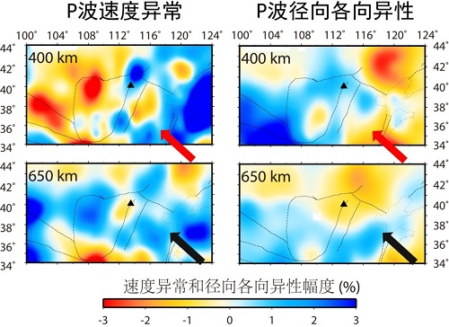 通过对速度及各向异性结构进行全面分析,他们得出了以下几点研究认识:(1)鄂尔多斯岩石圈地幔表现为高速异常以及负的径向各向异性,且一直从地表延伸至大约300公里深度,鄂尔多斯岩石圈地幔可能保留了其在太古代甚至更早形成时期的各向异性结构,并且其可能是通过高程度的热上涌或地幔柱熔融发生垂向生长而形成;(2)青藏高原东北缘上地幔物质(正的径向各向异性的低速异常)的挤出受到了鄂尔多斯岩石圈(负的径向各向异性的高速异常)的阻挡;(3)中部造山带上地幔中的低速异常延伸至大约200公里深度,表现出正的径向各向异性,这可能是由于华北克拉通东、西部岩石圈厚度差异引起中部的上升流变成水平运动,也可能是因为此上升流中含水导致C型橄榄石晶体优势排列而引起;(4)华北东部上地幔250-400km深度上存在着高速异常,表现为负的径向各向异性,与鄂尔多斯岩石圈地幔性质相似,其可能是被破坏的太古代克拉通岩石圈地幔(如图2红箭头所示);(5)华北东部地幔过渡带内存在高速异常且表现出正的径向各向异性,其可能是西太平洋板块(如图2黑箭头所示)。