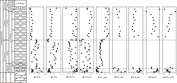 油气资源研究室蔡春芳研究员以及向雷博士生等选择贵州东南部渣拉沟剖面为研究对象,通过分析测试硅质岩、泥页岩有机碳、硫含量、铁组分、微量元素、有机碳、硫和氮同位素和黄铁矿的硫同位素组成,探讨了当时海洋的生物地球化学过程。贵州东南部渣拉沟剖面是一很好暴露的寒武-前寒武过渡剖面,当时是沉积于浪基面以下的一古高地。在寒武纪 Fortunian 世和第二世绝大部分时间(Fortunian 世,为寒武纪四分中最早的世)内,该位置底部海水是缺氧、富铁的,而表层是氧化的。由于海侵带来的富营养物及甲烷、或者因为热液导致甲烷水合物或气藏的泄露,导致当时海底富含甲烷。甲烷因有氧氧化或被硫酸盐缺氧氧化,造成了CO2和碳酸盐岩碳同位素值发生负偏,同时,浮游植物利用富12C的CO2进行光合作用,也导致了有机碳同位素值的负偏,出现有机和无机碳同时负偏的现象。在Stage 2最早期,该位置底水是硫化的,表层氧化水缺乏,仅以孤立的绿洲存在,FePy/FeHR > 0.7,黄铁矿的δ34S值约为-10‰,分散有机质(干酪根)与黄铁矿之间的差异(Δδ34S) 大。表层水因缺氧,NO3-贫乏,蓝细菌、硫细菌直接利用大气中的N2,干酪根的δ15N值显示为负值。进入Stage 3后,溶解氧气和硫酸盐的浓度开始明显增加,氧化的表层水和氧化-还原过渡带扩大,导致干酪根 δ15N值增大到2–4‰,黄铁矿的δ34S值轻到-24.6‰,Δδ34S高达37‰。因此,扩大的表层水可能是深海氧化的原因之一,它强化了动物的演化。反过来看,由于动物的出现,产生的粪球粒直接沉降而使得对水体中氧气的消耗降低,最终导致海水中的氧渐趋富集。