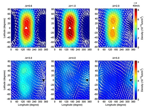 图1 耀斑爆发后不同时间400km高度热层大气密度及水平风场变化的全球分布特征