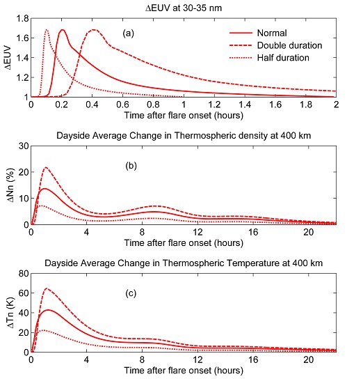 图2 不同持续时间的耀斑对热层密度、温度的影响