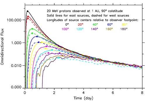 图1:源自日面不同经度位置的太阳高能粒子事件在地球附近的通量-时间剖面,呈现东(实线)-西(虚线)“相对经度”非对称分布现象