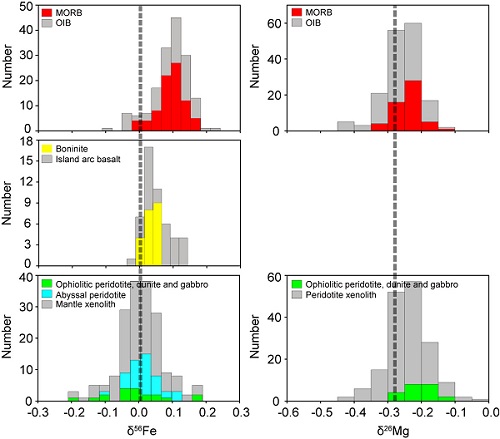 铁(Fe)和镁(Mg)作为地幔中主要的组成元素可以有效地指示地幔演化和深部过程。近年来开展的地幔Fe-Mg同位素研究表明:幔源岩浆的Fe同位素差异与部分熔融程度有关,而部分熔融几乎不会导致地幔源区的Fe同位素分馏;地幔具有均一的Mg同位素组成,部分熔融过程中不发生Mg同位素分馏(图1);地幔交代作用造成的Fe-Mg同位素分馏与熔体组成和性质有关;Fe同位素分馏与氧逸度相关,Fe3+(高氧逸度)相对富集重Fe同位素。然而,这些认识不能合理解释高氧逸度的岛弧火山岩具有比洋中脊和洋岛玄武岩轻的Fe同位素特征(图1)以及Fe和Mg同位素的耦合关系。