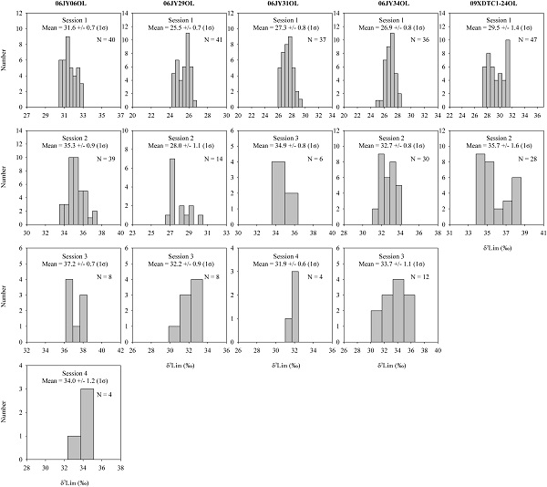 中科院地质地球所苏本勋副研究员在离子探针实验室与法国合作方一起针对地幔Li同位素组成及高温下Li同位素地球化学行为等科学问题,开展了标样研制工作。经过5年的研究,在进行了大量电子探针分析的基础上,对一批斜方辉石、单斜辉石和橄榄石样品进行了详细的离子探针分析,其中有3个斜方辉石、3个单斜辉石和5个橄榄石样品具有均一的Li同位素组成,每个样品的δ7Li测试值均在3‰~5‰的变化范围内(图1)。与此同时,法国合作者也在其实验室进行了Li同位素均一性检验,得到了相同的结果。因此,这些样品可以作为Li同位素标样。同时他们的研究结果揭示了橄榄石的Mg#值对Li同位素测试基体效应为1‰(图2)。这些标样的成功研发将对Li同位素地球化学及地质过程示踪研究起到极大的推动作用。