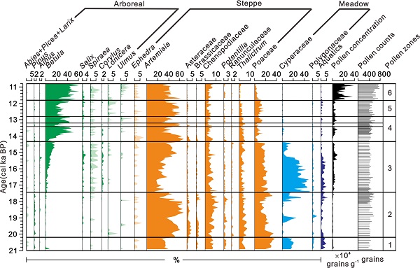 2016年1月5日,国际知名开放获取期刊PLoS ONE刊发了地质地球所新生代地质与环境研究室博士后伍婧等人关于末次冰消期大兴安岭中段地区植被和气候变化特征的研究成果。该研究揭示了距今约2.1-1.1万年期间,大兴安岭中段地区植被经历了亚高山草甸-干草原-亚高山草甸-森林草原的演化历史,并提出末次冰消期这一地区的植被演化主要由高纬地区控制的温度变化驱动;研究区有效湿度的变化在Bølling-Allerød暖期之前主要由蒸发量来决定,之后由东亚夏季风带来的降雨控制。