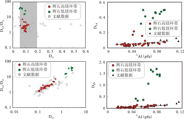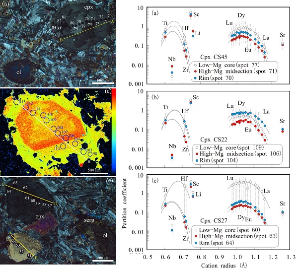 地质地球所岩石圈演化研究室前寒武纪学科组钱青副研究员及合作者通过对华北中生代高镁闪长岩的细致研究,观察到在橄榄石与低镁闪长质岩浆反应过程中,单斜辉石/岩浆之间元素分配系数受矿物成分、熔体成分的交替控制影响(图1,2,3)。其具体体现在:橄榄石的溶解导致岩浆Mg含量升高,岩浆聚合度降低,同时单斜辉石形成高Mg成分环带,此时REE、锆(Zr)、铪(Hf)的分配系数主要受单斜辉石成分(四配位Al)控制,分配系数与Al(Ⅳ)呈正比;而在橄榄石与岩浆反应的前后,岩浆Mg含量较低,聚合度较高,分配系数受到熔体成分控制,致使REE、锆(Zr)、铪(Hf)的分配系数较高镁岩浆-辉石体系提高一个数量级以上。