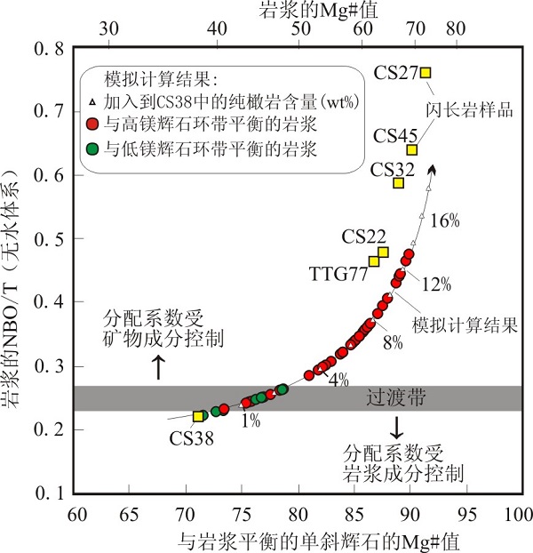 图3 闪长质岩浆-橄榄岩反应过程中,岩浆的聚合度与Mg含量关系的简单模拟计算。当NBO/T(岩浆聚合度指数)高于某一阀值,分配系数主要受矿物成分控制;低于该阀值,分配系数主要受岩浆成分(结构)控制。