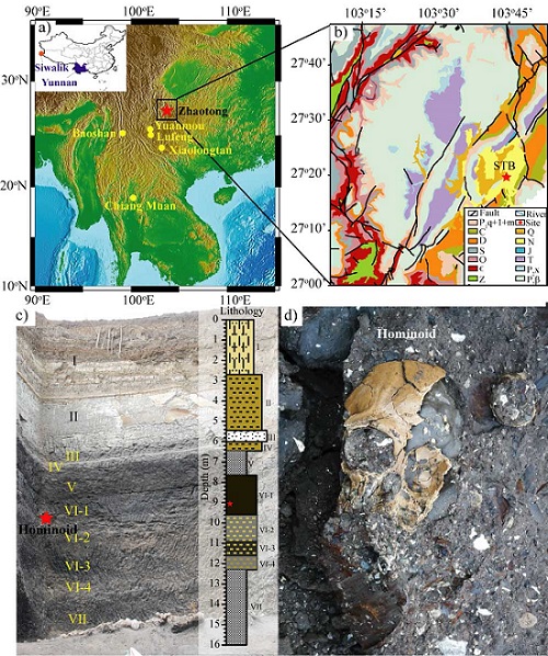 图1: a)研究区位置,b)地质图,c)昭通古猿出土点水塘坝剖面, d)昭通古猿出土化石